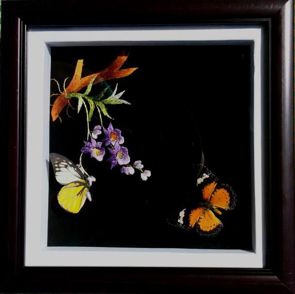 Đây là dòng sản phẩm kết hợp giữ những tác phẩm thêu tay độc đáo, tỉ mỉ với tiêu bản bướm tạo nên một phong cách tranh lạ và hấp dẫn tựa như tranh 3D.