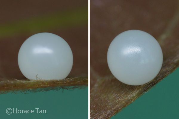 - Mặt trên: cánh trước con đực có một dãy các chấm chạy dọc theo mép trên lưng của cánh; một dãy chấm khác ở vùng trung tâm, dãy thứ 3 được tạo thành bởi 5 chấm chấm kép; một dãy chấm khác ở vùng đĩa cánh và một dãy chấm nữa chạy dọc theo mép cánh; ở vùng gốc cánh có những chấm đơn nằm ngang. Trên cánh sau có một chấm dài chạy từ gốc cánh xuống đến đoạn giữa mép bụng cánh, ngắt quãng tại đó rồi lại tiếp tục kéo dài đến gần cuối mép bụng cánh; còn có một dãy các chấm ở đĩa cánh và dãy các chấm chạy theo mép cánh. Bụng có màu đen.
